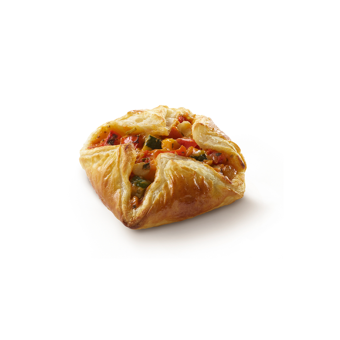 Butter puff pastry with roasted peppers, roasted zucchini and roasted eggplant.
