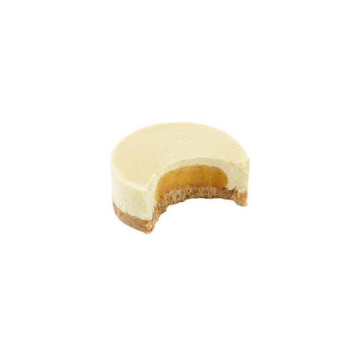 Dessert cheesecake with coconut crumble base, vanilla cheesecake base and passion fruit cream centre, frozen.