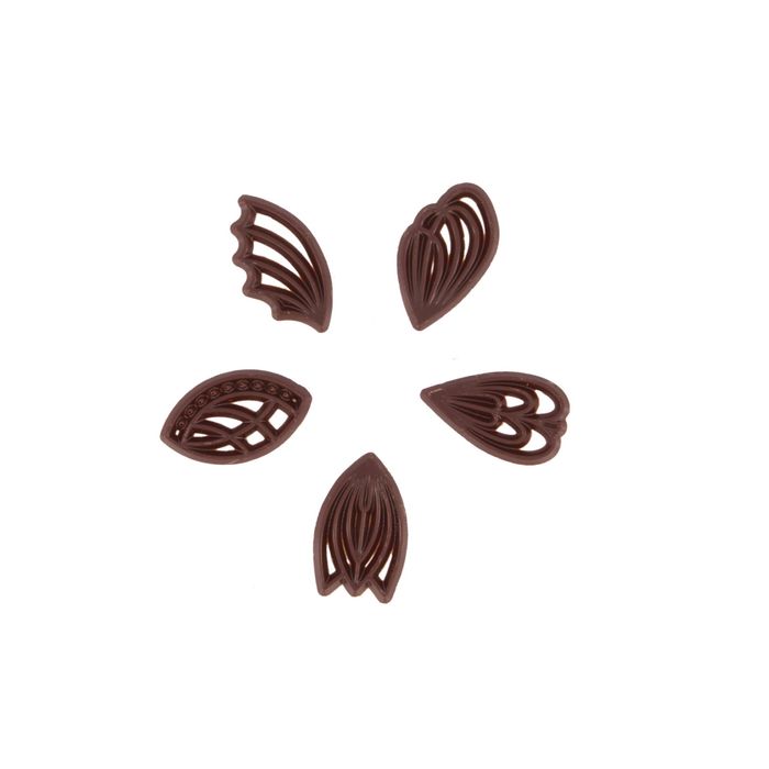 Decorations five styles in dark chocolate. 45mm long, 25mm wide