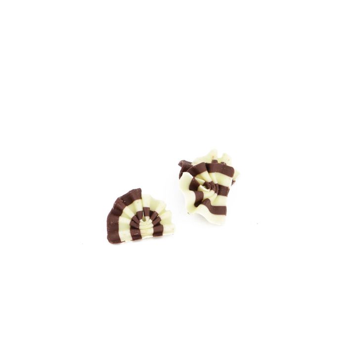 Rippled fan shaped decorations in dark and white chocolate. 27mm long, 35mm wide