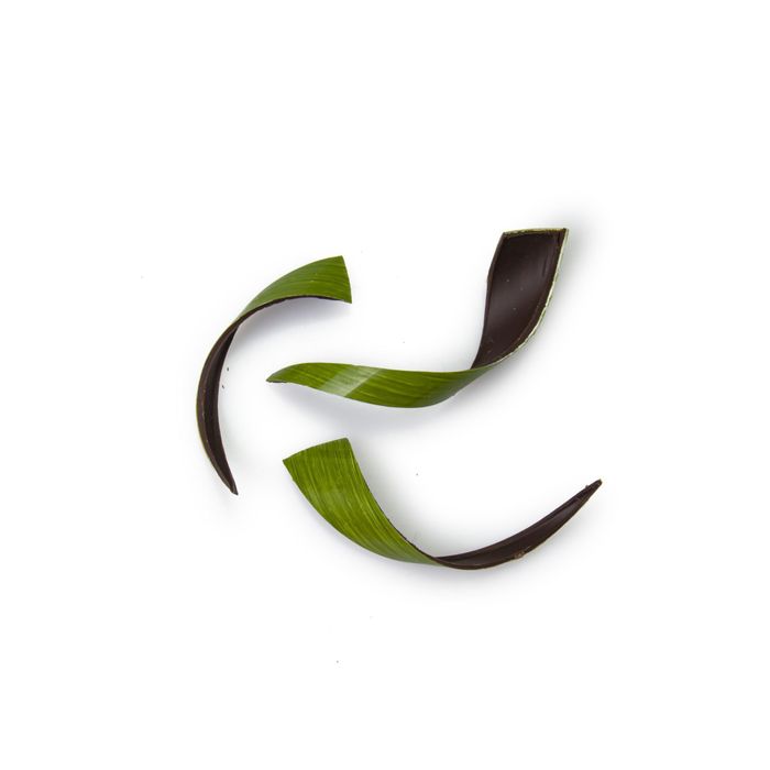Dark chocolate twist decoration, glossy green on one side. 84mm long, 20-30mm wide