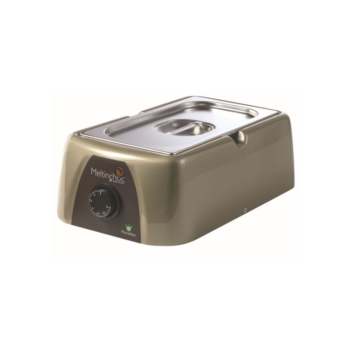 Chocolate melting machine, 3.6 litres. Designed for precision, ease of use, and compact size, these dry heat analogue melters are equipped with a removal stainless steel tank with plastic lid and chassis.